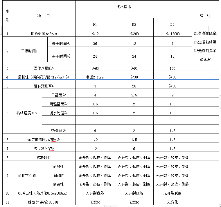 D2型防水涂料料具有與混凝土基面在干燥、潮濕條件下具有優(yōu)異的粘結(jié)性能,同時(shí)具有良好的涂層抗沖擊韌性,具有30%的延伸變形率,同時(shí)與混凝土結(jié)構(gòu)具有優(yōu)異粘結(jié)性能、具有優(yōu)異的防水性能,一般作為中涂或作為過渡粘結(jié)層使用。